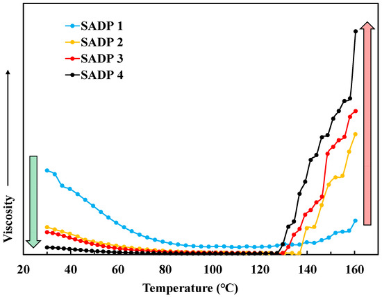 To better clarify the intriguing TG analysis previously discussed, an effort was made to better understand the viscosity-temperature characteristics of the SADP adhesives. Results are shown in Figure 6. It is important to emphasize that due to the different measurement method, the viscosity results shown in Figure 6 are not accurate values. Instead, these results should be analyzed through the lens of understanding the trend of change for each adhesive′s viscosity over the tested temperature range.