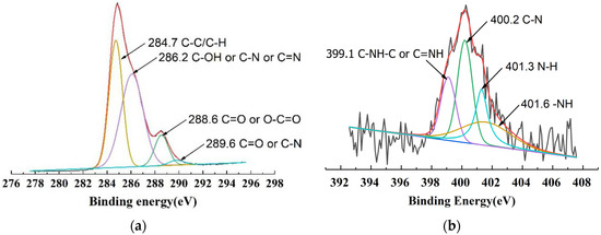 In our previous research, we recognized the existence of elemental nitrogen within the cured adhesive, which served as a significant clue towards developing a better understanding of the SADP adhesive’s curing mechanism within particleboard [24]. To further investigate this mechanism, in this work we chose to employ X-ray photoelectron spectroscopy (XPS) to further clarify the role that ammonium plays, and to learn how elemental nitrogen comes to be included within the finished product. Figure 8 shows the binding energy of the insoluble matter of each of the four tested adhesives. Specifically, the insoluble matter samples were obtained by first heating the liquid adhesive at 170 °C for 7 min, and next, by boiling the material in a water bath for 4 h. After the thermal treatments, the resultant mixture dried at 60 °C for 15 h, with the resultant solids serving as the substrate used for XPS analysis. From the results, it was observed that signals pertaining to C, N, and O all appeared across each tested specimen. In addition, the atomic mass content of C, N and O in insoluble matter derived from all the SADP adhesives were nearly the same. These values were approximately 74%, 2%, and 24%, respectively. It seems that the chemical elements composition of the insoluble matter was generally similar regardless of synthesis time. However, the spectra of C 1s and N 1s belonging to the insoluble matter from SADP 2 were further de-convoluted into four Gaussian peaks. These peaks represent the carbon-related and nitrogen-related chemical moieties, and from these peaks it is possible to develop a preliminary understanding of these chemical structures. Results from this analysis are shown in Figure 9. Regarding the de-convoluted C 1s peak (Figure 9a), binding energy (BE) at 284.7 eV is believed to be derived from both C–C and C–H bonds, two covalent linkages that clearly serve as the dominate bond within the insoluble cured polymer [37]. The signal at 286.2 eV reveals the existence of a C–OH, C–N, or C=N bond [38,39,40]. The peaks located at 288.6 and 289.6 eV were also considered to belong to carbonyl groups (C=O) or O–C=O [41,42], carboxylic groups (C=O), or C–N bonds [43]. The N 1s XPS of SADP 2 also could be separated by peak fitting into four spectral components, and the results are shown in Figure 9b. The BE signal located at 399.1 eV was attributed to C–NH–C or C=NH groups [44,45]. The peaks observed from 400.2 and 401.3 eV were common signals of C–N and N–H [46,47], respectively. The BE that appeared at 401.6 eV was possible due to –NH [48].