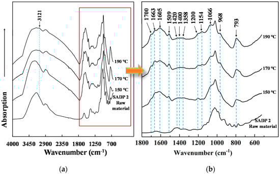 In effort to further clarify the chemical structural changes experienced by our SADP adhesives over the course of the curing process, we recorded ATR FT-IR spectra to serve as a complimentary information source alongside the previously discussed XPS findings. Figure 10a shows the adsorption bands exhibited by the uncured SADP 2 and the insoluble masses obtained from SADP 2. In addition, the informationally dense region of 1800–500 cm−1 has been enlarged and can be found in Figure 10b. Compared with the uncured SADP adhesive, 13 new peaks were generated in the cured adhesives. The peaks located at around 3121, 1509, and 793 cm−1 were possibly due to new C–H and C=C stretching vibrations, as well as the CH=CH bonds present within resultant furan rings [24,49,50]. In addition, these absorption bands increased in resolution when increasing the heating temperature, indicating the curing process along with the polymerization of the furan compounds. Also, a new peak at around 1700 cm−1 could be found in the cured material, something that was attributed to the carbonyl functionalities [51]. Meanwhile, the absorption band at 1605 cm−1 was attributed to aromatic C–C strength, and this band is ubiquitous in the spectra of coals, chars, and several other heat-treated carbonaceous materials [52]. The peaks at 1663 and 1154 cm−1 were assigned to a C=N group of imine [53] and C–N bonds [54]. In addition, the presence of a feature between 1358 and 1421 cm−1 strongly resembled those of C–N=C in imine (Schiff base) [54]. These groups confirmed the formation of Schiff bases during the curing process, and the imine linkage seems established by the polymerization between the Schiff base and the aldehydes compounds derived from the dehydration of sucrose. Moreover, the peaks located at 1200, 1066, and 968 cm−1 were considered as C–O–C stretching, C–O bending, and C–O symmetric stretching vibrations [55,56], respectively. These groups indicated that the dimethylene ether bridges seemed to be another significant linkage in the cured adhesive.