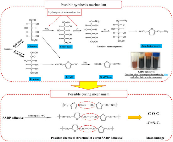 Based on the previous chemical analysis of both uncured and cured SADP adhesives, we have attempted to provide an overview of all the possible reactions that could take place during the synthesis and curing process, and the possible synthesis and curing mechanisms are shown in Figure 11. During the adhesive synthesis process, it appears clear that ammonium catalyzed the sucrose hydrolysis to glucose, and fructose initiated the formation where a part of the liberated hexoses were next converted to 5-HMF. Meanwhile, the heating treatment facilitated the hydrolysis of an ammonium ion to ammonium hydroxide, and possibly reacted with 5-HMF and the reducing monosaccharide to form heterocyclic compounds and a Schiff base by Amadori rearrangement. The synthesized SADP adhesives contain monosaccharide, 5-HMF, Schiff bases, and countless other presently undescribed reaction products. From this complex mixture, it appears that during the curing process, a series of dehydration condensation of the furan compounds and Maillard reactions also possibly take place to form a polymeric material, which is mainly composed of polyfuran and linked by C–O–C and C=N–C linkage. This final polymerized material is then capable of forming network adhesives upon woody substrates, resulting in the bio-based adhesives desired by both producers and consumers of wood products worldwide.