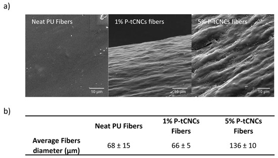 Further investigations should address the integrity of P-tCNCs in melt-extruded fibers, the nature of their bonding to the PU matrix, and the variation of the mechanical properties of the composite with fiber diameter.
