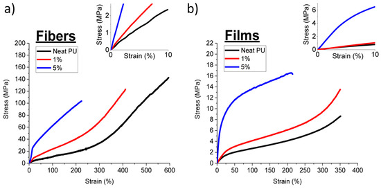 Representative stress-strain curves of (a) P-tCNC nanocomposite fibers and (b) P-tCNC nanocomposite films. The insets are magnifications near the origin of the graphs, which were used to determine the Young’s modulus of the materials.