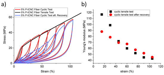 (a) Cyclic tensile test experiments performed on 5 wt% P-tCNC nanocomposite fibers, raising the strain to 5%, 15%, 30%, 45%, 60%, 75%, 90%, 105%, followed by unloading the sample (red). After a full series of cycles, the fibers were annealed for 3 days at 50 °C and the measurement was repeated (blue). A simple non-cyclic tensile test is shown for comparison (black). (b) Evolution of Young’s modulus during the cyclic tensile test before and after recovery, showing that the initial stiffness can only be partially recovered.