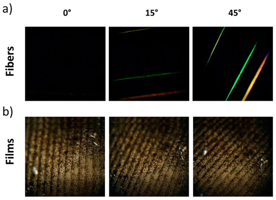 Images that showcase angular birefringence measurements of fibers are shown in Figure 6a. The fiber birefringence varies strongly with their relative position between crossed polarizers. When the fibers are parallel to one of the two polarizers, extinction of the birefringence is observed. Upon the rotation of the sample, a progressive increase of birefringence is detected, with a maximum at 45°. This angle-dependent behavior in nanocomposite fibers demonstrates their overall highly anisotropic nature, with a preferred orientation along the fiber axis. A similar experiment was carried out with a nanocomposite film containing 5 wt% P-tCNCs, as shown in Figure 6b, where no variation of the birefringence intensity with film rotation between crossed polarizers was observed, confirming the isotropic nature of the nanocomposite films.