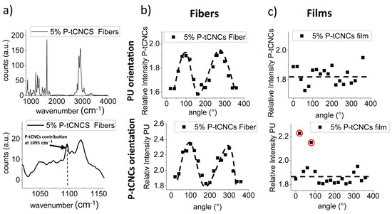 The angular dependences of the two characteristic Raman bands associated with the PU matrix and the CNCs in the 5 wt% nanocomposite fibers are shown in Figure 7b. The graphs reflect that the signal intensities are indeed highly dependent on the sample orientation, with intensity maxima at 90° and 270°, i.e., in arrangements where the fiber direction is parallel to the polarization of the laser. Intensity minima were detected when fibers are oriented perpendicular to the laser polarization, at 0° and 180°. These results suggest that the PU hard segments and P-tCNCs are predominantly aligned along the fiber axes. Nanocomposite films were also tested, and their angular Raman plots show no preferential orientation of either the PU hard domains or the P-tCNCs, confirming the isotropic nature of the film, as shown in Figure 7c. Note that the processing-induced PU alignment in fibers observed here was not seen in previously reported melt-spun PU/CNC nanocomposite fibers [38].