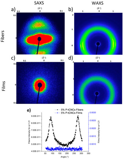 2D small and wide-angle X-ray scattering spectra of (a,b) 5 wt% P-tCNC nanocomposite fibers and (c,d) 5 wt% P-tCNC nanocomposite films. (e) Azimuthal integration of the (200) P-tCNC reflection at q = 1.21 Å−1.