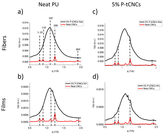 Azimuthal integration of the 2D WAXS images provides information on the characteristic reflections of crystals within the nanocomposite materials. Figure 9 shows that neat PU fibers and films possess the same intense reflection centered at 1.1 Å−1. Interestingly, films exhibit another reflection located at 1.17 Å−1, which is not detected in the fiber spectrum. This additional reflection might be due to the difference in processing. During solvent casting, the slower evaporation of DMF may promote self-assembly in the nanocomposite, increasing order within the material. Characteristic P-tCNC reflections at 0.8 Å−1, 0.9 Å−1, 1.24 Å−1, and 1.92 Å−1 are also shown and indexed in Figure 9. Other CNC reflections might be obscured by the intense PU signal.