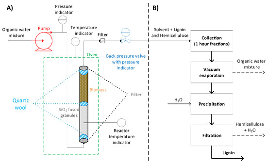 Schematic overview of the extraction procedure, showing (A) the developed flow-through setup and (B) the workup procedure for lignin isolation.