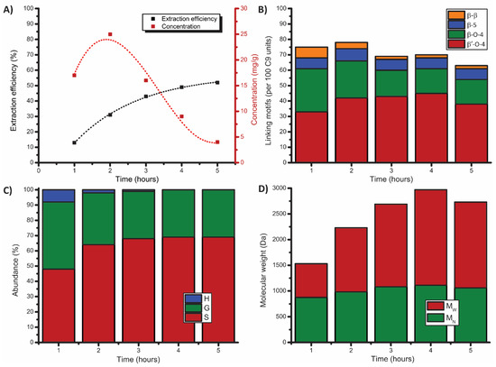 Results of the mild organosolv extraction (80:20 EtOH/H2O, 0.18 M H2SO4, 120 °C, 5 h), showing (A) extraction efficiency (corrected for alcohol incorporation as determined by 2D HSQC) and lignin concentration, (B) linking motifs distribution and (C) H/G/S ratio as determined by 2D HSQC, and (D) molecular weight distribution as determined by GPC (THF).
