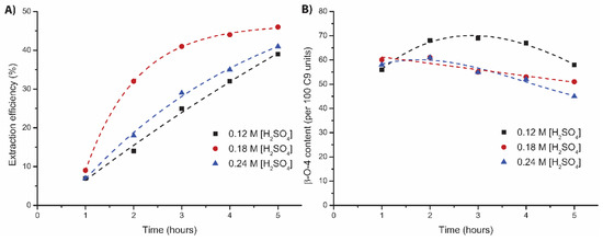 Firstly, the influence of the acid concentration on the extraction efficiency and lignin properties was examined. As the result with 0.18 M H2SO4 was already very good, it was decided to start with some small changes in acid concentration (0.12 M and 0.24 M H2SO4, Tables S2–S4 in Supplementary Materials). With 0.24 M H2SO4, comparable extraction efficiency was obtained after 5 h, but in the first hours, extraction occurred with smaller increments for the extraction with 0.24 M H2SO4 (Figure 4A). It should be noted that during this experiment, from the second hour onwards, the flow was only half of the target flow, which could explain part of the difference in the extraction rate and can be compensated for by plotting the result as a function of solvent used (Figure S2 in Supplementary Materials). The structural quality was similar in the first three hours, after which a sharper decrease in structural quality was observed for the extraction with 0.24 M H2SO4 (Figure 4B). The extraction with 0.12 M H2SO4 gave a more gradual extraction profile (Figure 4A), but the total extraction efficiency was slightly lower compared to the extractions with a higher acid concentration. The total β-O-4 content (64 linking motifs) was markedly higher for the extraction with 0.12 M H2SO4, compared to the extractions with higher acid concentrations (55 linking motifs for 0.24 M H2SO4, Figure 4B). A total β-O-4 content of 65–70 linking motifs was obtained in the middle fractions (2–4 h) of this extraction and an average β-O-4 content of 64 linking motifs. This is sharp contrast with the 35 β-O-4 linking motifs that we reported for the batch extraction with identical reaction conditions [46], showing the superior performance of this extraction setup in terms of structure preservation, while showing only a small decrease in extraction efficiency. These results clearly show the influence of the acid on lignin fractionation and depending on the requirements (rapid delignification or obtaining lignin of high structural quality), a different acid concentration can be the preferred option.