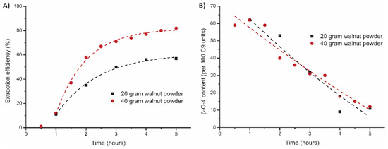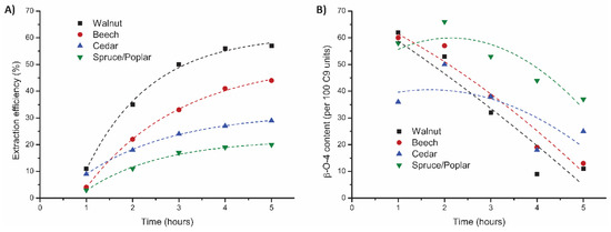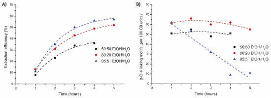Influence of the different EtOH/H2O on the mild organosolv extraction * (0.18 M H2SO4, 120 °C, 5 h) on (A) extraction efficiency (corrected for alcohol incorporation as determined by 2D HSQC) and (B) total β-O-4 content as determined by 2D HSQC. * The 50:50 EtOH/H2O experiment was stopped after 4 h due to the reactor clogging.