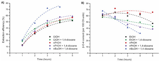 Influence of alcohol on the mild organosolv extraction (80:20 alcohol/H2O *, 0.18 M H2SO4, 120 °C, 5 h) on (A) extraction efficiency (corrected for alcohol incorporation as determined by 2D HSQC) and (B) total β-O-4 content as determined by 2D HSQC. *W hen 1,4-dioxane was used, an 80:15:5 alcohol/H2O/1,4-dioxane ratio was applied.