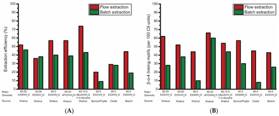 To clearly demonstrate the advantage of using the flow-through setup, most of the extractions discussed above were repeated in a batch setup using the same conditions and the results were compared (Figure 9). The flow-through setup proved to be superior for all these comparative experiments in terms of both extraction efficiency as well as quality of the obtained lignin. For most extractions, an increase in the range of 20% in extraction efficiency was achieved. Additionally, the flow-through setup provided lignin with a β-O-4 content in the range of 45–60 β-O-4 linking motifs, whereas in the batch system the β-O-4 content decreased to 8–30 β-O-4 linking motifs for the extractions performed with over 80% EtOH. This clearly shows that a shorter residence time of extracted lignin in the reactor is key for obtaining high-purity lignin. With nPrOH and nBuOH, the effects were not as profound, as the β-O-4 content was high with both extraction setups, but still an increase in both structural quality and extraction efficiency were observed for the flow-through setup. Furthermore, the degree of condensation was considerably lower for most flow-through extractions as was the increase in molecular weight for the obtained lignin (Tables S1, S5–S8 and S12–S15 in Supplementary Materials). Analysis of the solvent efficiency (Appendix A and Appendix B) showed that the batch setup was somewhat more efficient after 5 h extraction when EtOH and nPrOH were used as solvent. With nBuOH as solvent, the flow-through setup was the slightly more efficient system. A closer look at the values shows that the extraction efficiency of 2 h extraction with the flow-through setup was, in most cases, comparable to the extraction efficiency of 5 h batch extractions. When taking this into consideration, the flow-through setup had a markedly higher solvent efficiency compared to the batch setup. Thus, overall it can be concluded that the flow-through extraction setup was superior to a conventional batch setup in terms of both extraction efficiency and structural quality and being comparable in terms of solvent efficiency.