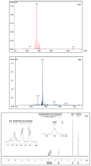Figure 2a,b shows the LC-MS spectra of the synthesized ACAT. It can be seen that the maximum intensity in the MS+ spectrum occurred at 289.1 m/z, while the maximum in the MS- spectrum occurred at 286.9 m/z. These results suggest that the synthesized powder is ACAT. In theory, the molecular weight of ACAT is 288 g mol−1. The peak shifted by +/−1 which could be attributed to H.