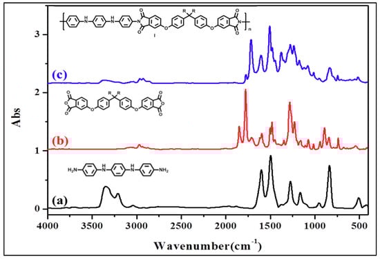 FTIR spectra of (a) synthesized ACAT, (b) BSAA, (c) synthesized electroactive PI.