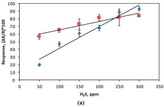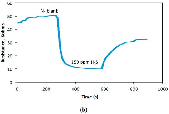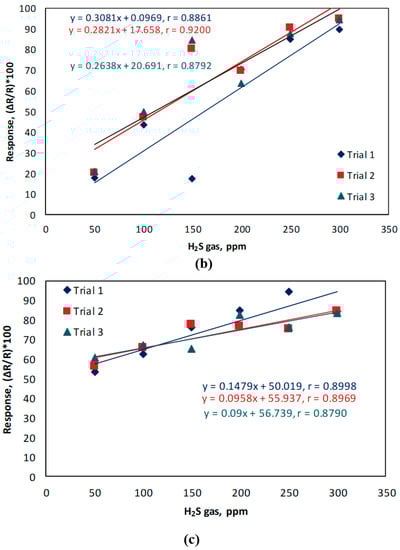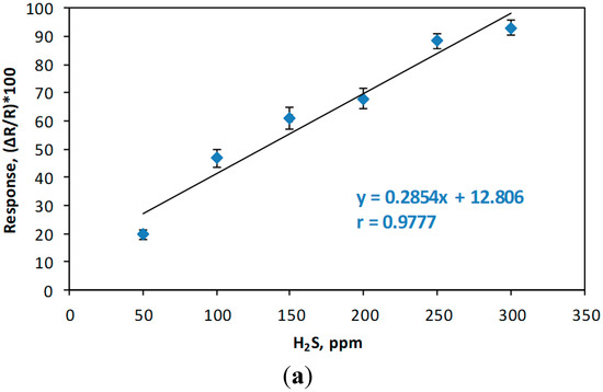 Sensitivity, linearity, and limit of detection. Shown in Figure 6a is the calibration curve constructed based in the performance of electroactive polyimide doped with gold nanoparticles (PI/AuNPs) towards increasing concentration of hydrogen sulfide gas. Responses were reported as (∆R/R0) × 100%; ∆R=/Rg − R0/, where Rg is the resistance of the chemiresistor gas sensor and R0 refers to baseline resistance. The sensor presented a sensitivity of 0.29% ppm−1 H2S gas and a linearity of 0.9777 at a dynamic linear concentration range of 50 to 300 ppm H2S gas. The theoretical detection limit was found to be 0.142 ppm or 142 ppb H2S, estimated according to the least-square method of fitting in the linear regime.