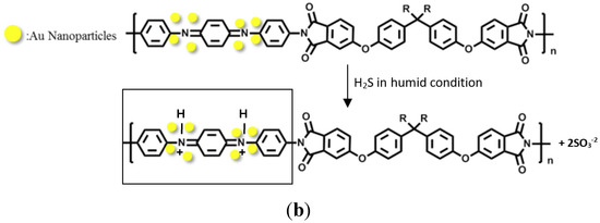 As indicated in Figure 6b, the decrease in resistance in the electroactive PI/AuNPs film could possibly be attributed to further doping of the polymer due to the sulfurous acid formed. Hydrogen sulfide gas (Ka = 1.1 × 10−7) in humid condition may generate sulfurous acid (Ka = 1.3 × 10−2), which consequently dissociates more effectively into hydrogen and sulfite ions. At room temperature and pressure, the hydrogen ions, then, protonate the polymer’s imine nitrogen sites of the ACAT chains. This phenomenon results to a corresponding increase in conductivity or decrease in resistance. Experimental data show that higher concentrations of H2S gas lead to higher decrease in resistance. It is speculated that the resulting positive charges in the imine nitrogen are counteracted by the negatively charged sulfite ions. Furthermore, the gold nanoparticles could possibly be contributing to the stabilization of the interaction by attracting the sulfur-containing counter ions toward the ACAT segments.