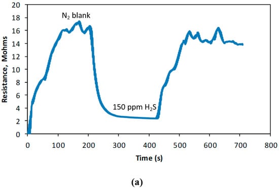 There have been reports on the use of gas chromatography (GC) [22,23,24], infrared spectroscopy (IR) [25], ultraviolet spectroscopy (UV) [26,27,28,29], and fluorometry [30] in H2S determination, but these techniques involved the use of relatively expensive bulky instrumentation, and required tedious sampling preparations. Alternatively, the use of sensors was also a subject of heightened interest due to the many modes of detection that could be explored, such as electrochemical [30,31,32], optical [33,34], piezoelectric [35,36], and chemiresistive [37,38]. Sensors based on the chemiresistive mode was the simplest, operating based on the change in electrical resistance as the sensing material absorbs the gas analyte [39,40,41,42,43]. Metal oxide sensors (MOS) have been widely used in the construction of chemiresistive sensors of noxious gases due to their inexpensiveness and simplicity in both preparation and operation. These sensors also offer a wide array of detectable gases, hence expanding possible fields of applications. However, gas sensors fabricated using inorganic materials like metal oxides require operation at higher temperatures, as the high sensitivity of the said sensors is based on the high working temperature. This is often possible through the use of heated filament, and this entails the requirement of a higher amount of electricity to operate [44,45]. On the other hand, conducting polymers (CPs) also appear attractive as active elements in gas sensors. Compared with MOs, CPs present many advantages, such as high sensitivity, short response time, and room temperature operation. However, CPs offer low processability, and poor mechanical strength and chemical stability [46,47]. There have also been reports on the use of metal nanoparticles such as silver nanoparticles [26,48], and gold nanoclusters [30,49], but the detection is coupled to costly optical measurement devices.