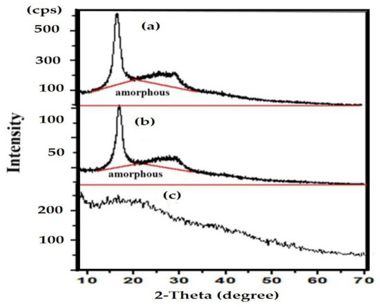 Another indication for the formation of cyclic nitrogen-containing structures can be deduced from the XRD data in (Figure 2a–c). The two X-ray diffractograms of PAN–g–AG (Figure 2a) and hydrazine modification of PAN–g–AG (Figure 2b) show two crystalline peaks at a maximum of nearly 2θ = 16° and 29°, which can be attributed to Brag planes (010) and (300), respectively. The crystalline structure of PAN–g–AG was expected, as a result of the special helical confirmation of PAN grafts due to the dipole interactions of nitrile groups [31]. The modification of PAN–g–AG with hydrazine (Figure 2b) shows peaks with lower intensity than that obtained for PAN–g–AG (Figure 2a) to confirm the greater ordering of nitrile dipole interaction with the hydrazine modification of PAN grafts [32]. On the other hand, Figure 2c reveals the amorphous nature of the basic modification of hydrazine PAN–g–AG may indicate the conversion of all nitrile groups to carboxamide and carboxylate during the progress of the saponification reaction.