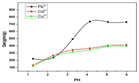 The pH of the metal ion solution plays a major role in the whole adsorption process, especially on adsorption capacity, by modifying the level of ionization of superadsorbent-modified PAN–g–AG [34]. To investigate the effect of different pH values on the metal uptake by the modified PAN–g–AG, five different pH concentrations from 1 to 6 were adjusted in suspensions of the polymer before adding the metal salt solutions. This pH range was chosen to avoid the precipitation of metals as metal hydroxide as a result of excessive pH, and hence the removal of the metal could be dependent on the adsorption process only [35]. In Figure 4, the data show that the amount of metal ions adsorbed by modified PAN–g–AG gradually increased from pH 1 to 6, reaching a peak at pH 5 in the case of Pb2+ and at pH 6 in the case of Cd2+ and Cu2+. The specific capacities decreased in the following sequence: Pb2+ > Cd2+ > Cu2+. The modified PAN–g–AG showed high efficiency in removing heavy metals, even at pH 2, where about 45%, 37% and 25% of Pb2+, Cd2+ and Cu2+ at an initial concentration of 100 mg/L of metal ions could be absorbed. This attribute may be because a result of the synthesized modified PAN–g–AG having the advantage of combining various functional groups with different exchange characteristics, such as 4-amino-l,2,4-triazole, dihydrotetrazine and tetrazine groups, as well as carboxylate and carboxamide functions. Therefore, the ion exchange seems to meet one of the highly efficient polymers for the removal of heavy metal ions from acidic and neutral water.