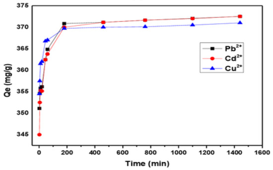 The effect of contact time was studied by varying the equilibrium time from 2 min to 24 h at pH 5 for Pb2+, Cd2+ and Cu2+ adsorption onto modified PAN–g–AG. Figure 6 clearly demonstrates that the amount of Pb2+, Cd2+ and Cu2+ adsorbed onto modified PAN–g–AG was nearly 93% after only 2 min for an initial concentration metal ion of 150 mg/g. Subsequently, the adsorption rate rises gradually and reaches equilibrium after 2.5 h. The short time required to reach equilibrium revealed that modified PAN–g–AG has a very high adsorption efficiency and a great potential in Pb2+, Cd2+ and Cu2+ adsorbent applications [37].