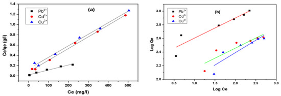 where b is the Langmuir equilibrium constant (l/mg), and qm (mg/g) is the monolayer adsorption capacity. Both are calculated from a plot Ce/qe versus Ce (Figure 7a). The Langmuir parameters were determined from the linear relations (Figure 7a) and are listed in Table 2. The data show that the adsorptions of all metal ions have higher linear coefficients (R2) when they are nearer to 1. This elucidates the homogeneity of PAN-g-AG surfaces (Figure 3b–d) and the formation of the monolayer of the adsorbed metal ions onto the modified PAN–g–AG surfaces. Moreover, the agreement between the values of the experimental adsorption capacities (Qexp.) and those calculated (Qm) using the Langmuir model confirms that the adsorption process of all metal ions for Pb(II), Cd(II) and Cu(II) obey the Langmuir model.