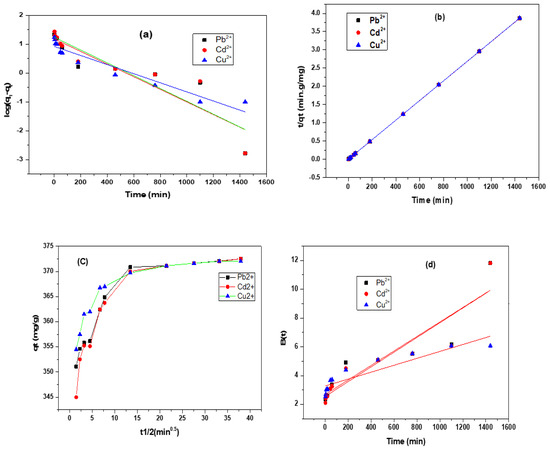 Kinetic models for adsorption of Pb (II), Cd (II) and Cu (II): (a) pseudo-first order, (b) pseudo-second order, (c) intra-particle diffusion, and (d) Boyd plot.