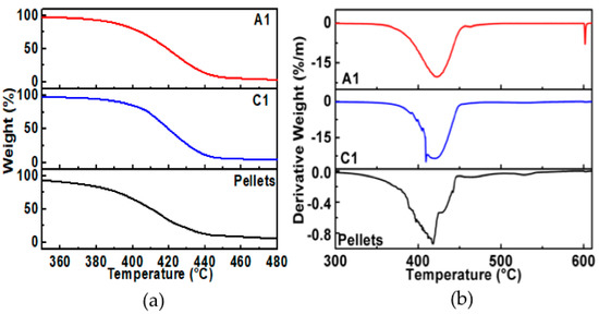The thermogravimetric analyses were performed using TGA Perkin–Elmer Pyris 8000 equipment (México City, México) with a heating rate of 10 °C/min. The samples were scanned in a temperature range from 50 °C to 700 °C using air as a purge gas.