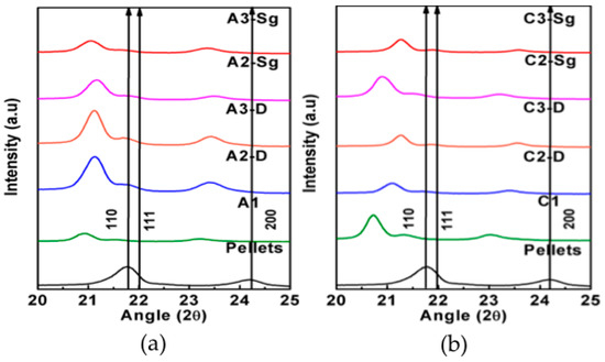The diffractogram for the PCL reference material shows two peaks at 21.7° and 24.1°, corresponding to (110) and (200) diffraction planes, as shown in Figure 4. These peaks are characteristic of the PCL orthorhombic unit cell [23]. As expected, the use of acetic acid solvent during the preparation of the PCL membrane (A1), modifies the formation of crystal domains because of the shift shown in Figure 4a to lower angles of the (110) and (200) planes, as well as the detection of the (111) plane. The same behavior was detected when the TiO2 was incorporated in the composites A2-D, A3-D, A2-Sg, and A3-Sg, which indicates that the NPs do not play an important role during the PCL crystallization, thus proving that the main change is induced by the solvents.