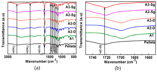 (a) FT-spectra shows wavenumber shifts between the material samples A1, A2-D, and A3-D and the Pellets. (b) Samples spectra zoom in the lower wave number values.