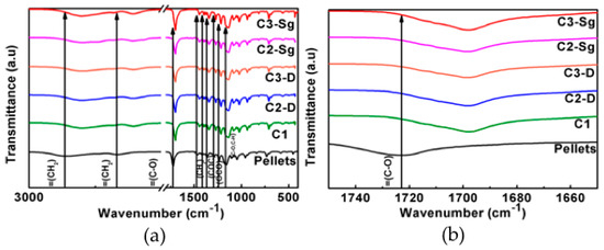 (a) FTIR spectra shows wavenumber shifts between the material samples C1, C2-D, and C3-D and the Pellets. (b) Samples spectra zoom in at lower wave number values.