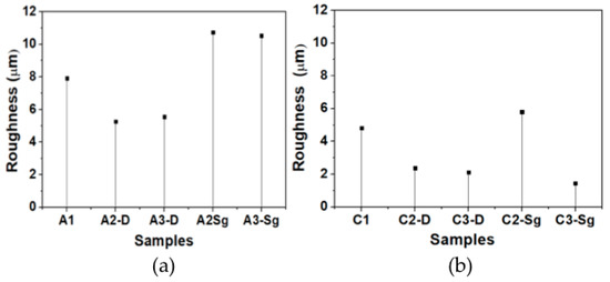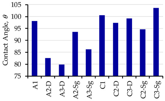 Experimental values collected from contact angle (CA) and uniaxial extension tests are displayed in Figure 7. From CA tests, one can see from Figure 7 that the reference samples A1 and C1 exhibit a similar hydrophobic permeability behavior due to the presence of CH2 groups in the PCL backbone. For composite membrane samples elaborated with acetic acid (A2-D, A3-D, A2-Sg, A3-Sg), a relative decrement in the contact angle is observed in Figure 7 because of the reagents low compatibility. Also, notice from Figure 7 that the samples C2-D, C3-D, C2-Sg, and C3-Sg exhibit slight changes on their CA, while maintaining a hydrophobic behavior. In this case, sample C3-Sg shows the highest CA value.