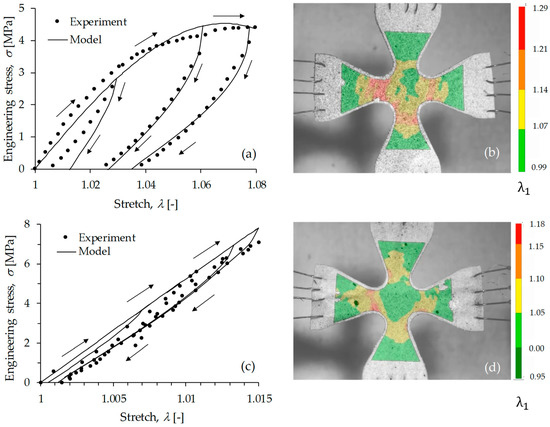 Equibiaxial loading-unloading cyclic tests for A1 and C1 material samples. (a) Sample A1 stress-stretch curve that corresponds to the central point of the cruciform specimen shown in (b). (c) Sample C1 stress-stretch curve that corresponds to the central point of the cruciform specimen shown in (d). Figures (b,d) illustrate experimental stretch measurement performed through digital image correlation. Experimental measurements are indicated by black dots, while the solid lines represent the computed theoretical predictions obtained from Equation (1). The arrows indicate the direction of loading and unloading cycles performed in the test.