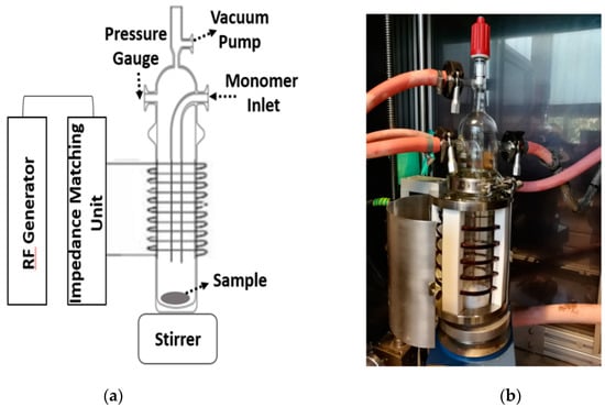 The custom-designed radio frequency (13.56 MHz) vertical plasma reactor is shown in Figure 1. A schematic diagram is given in the left part of Figure 1a, and the actual reactor is shown in Figure 1b. This plasma reactor setup consists of four parts:
