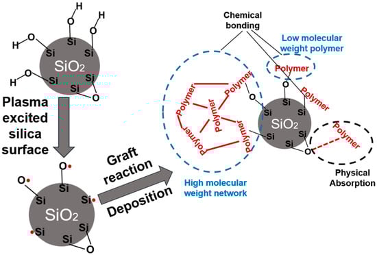 The silica samples were treated at the same gas flow rate (6 cm3/min) with different RF power settings for a duration of 1 h. The TGA results indicated a two-step thermal degradation kinetics of the deposited organic coating. The first step starts around 300 °C and the second around 450 °C. Further mass loss (above 600 °C) can be explained by the remaining silanol group condensation similar to the reference silica sample. The two-step decomposition kinetics indicate the presence of various hydrocarbon species on the silica surface [24,25]: Linear and branched polyacetylene chains, that degrade at lower temperatures, and highly cross-linked or possibly even carbonized structures [26] decomposing at higher temperatures. A schematic diagram of the plasma modification mechanism is shown in Figure 2. The cross-linked high molecular weight network is caused by small fragments, radicals, and atom formed in the plasma. These species recombine randomly together to form new irregular structures on silica surface.