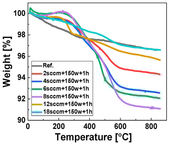 To evaluate the Acetylene Plasma Polymerization Silica Coating, thermogravimetric analysis (TGA) was performed using a Perkin-Elmer TGA-7 thermogravimetric analyzer (Waltham, MA, United States). This analysis was performed for the reference silica sample, as well as the plasma-modified silica samples. This characterization was done in a synthetic air atmosphere with a heating rate of 20 °C/min and a temperature range from ambient temperature to 850 °C.