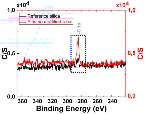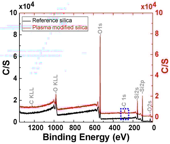 X-ray photoelectron spectroscopy (XPS) spectra of reference silica and plasma-modified silica (plasma settings: 8 sccm, 150 W, 1 h).