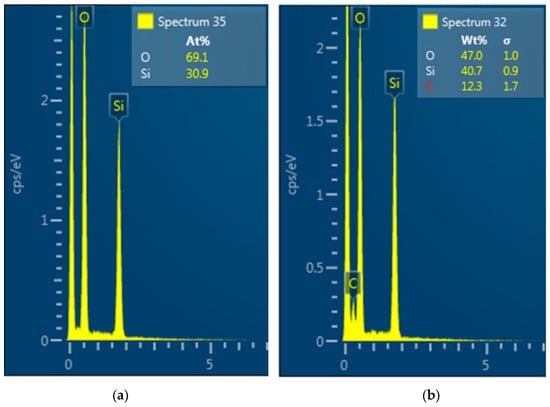 EDX spectrum of the reference silica (a) and plasma modified silica (b).
