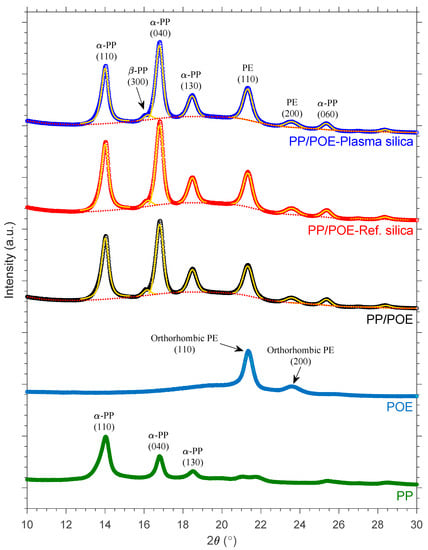 X-ray diffraction patterns of neat polypropylene/poly(ethylene-co-octene) (PP/POE) blends, reference silica filled PP/POE blends and plasma modified silica filled PP/POE blends. XRD diffraction patterns of PP and POE components are also shown (hot-pressed samples). The solid yellow lines and dashed red lines show the fitted crystalline peaks (pseudo-Voigt) and amorphous background (cubic spline) from the multi-peak fitting procedure, respectively. The curves are shifted vertically for clarity and the predominant diffraction peaks are labeled.
