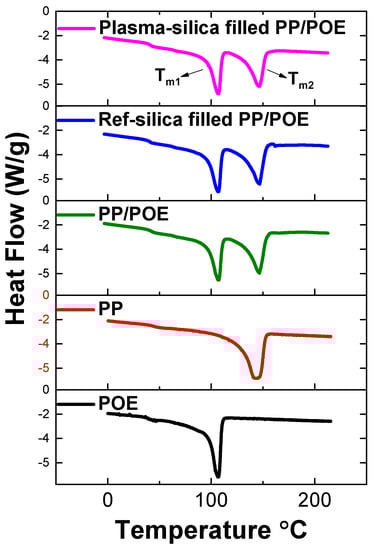 In order to further characterize the crystallinity of the composites as found by XRD, DSC tests were performed. The melting and crystallization process of neat PP/POE blends, reference silica filled PP/POE blends (R-silica filled PP/POE), and plasma modified silica filled PP/POE blends (P-silica filled PP/POE) were studied. The DSC results are shown in Figure 12 and Figure 13.