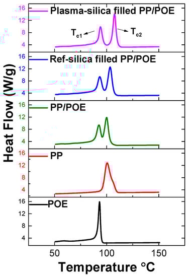Figure 13 shows the cooling curves of the three compounds and the two neat polymer matrices (PP and POE). It also clearly shows the two cooling peaks belonging to POE and PP. The crystallization temperature of both crystalline phases of P-silica filled PP/POE are higher than that of R-silica filled PP/POE and neat PP/POE as shown in Table 5. This is due to nucleation effect of silica, which is dispersed in both PP/POE phases. However, the results of DSC cooling curves suggest that the silica is predominantly located in the PP phase characterized by higher crystallization onset temperature. Plasma modified silica exhibits better nucleating performance most probably due to its higher surface compatibility with PP/POE matrices than the unmodified, highly polar silica.