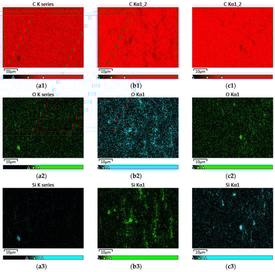 To evaluate the dispersion of the unmodified and plasma modified silicas in the PP/POE polymer matrix SEM–EDX elemental mapping was applied (Figure 15). Figure 15 shows the distributions of carbon (a1, b1, c1), oxygen (a2, b2, c2), and silicon (a3, b3, c3), which were probed using SEM–EDX to measure the intensity of the Kα line across the three composite samples (a), (b), and (c). The silicon and oxygen mapping images show the increase of the dispersion level for plasma modified silica. This is an expected result confirming the positive effect of the plasma modification on the silica/PO compatibility. The signals from silicon visible in the neat PP/POE sample (a3) come most likely from a silica contamination.
