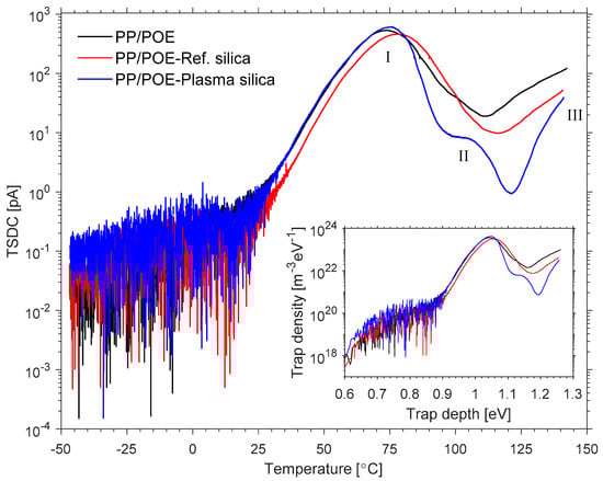 TSDC spectra of neat PP/POE, reference silica filled PP/POE, and plasma modified silica filled PP/POE. The inset shows the calculated trap depth versus density distributions.