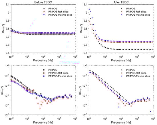 Real and imaginary parts of the permittivity data of the injection molded samples are presented in Figure 18 as a function of frequency at room temperature. The pristine injection molded samples, measured right before the TSDC experiments, are considered first (Figure 18, left column). For the unfilled PP/POE composite, the real part of the permittivity at 1 kHz was 2.73 which is slightly higher than that of pure PP (~2.25). A subtle increase in the real permittivity was observed upon incorporation of silica: The real permittivity at 1 kHz increased to 2.74 and 2.75 for reference silica and plasma silica, respectively. Such a small difference in these three composites is however negligible when considering the instrumentation accuracy. All the composites showed ultra-low dielectric loss at higher frequencies, with values in the 10−4 range which is typical for PP. However, at lower frequencies a considerable increase in the imaginary part of was observed. When a material shows a non-negligible DC conductivity, the imaginary part of the complex permittivity contains both the polarization and conduction losses [39]: