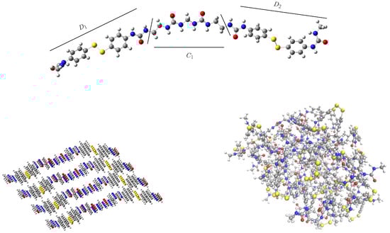 In the previous work, the model comprised a single chain formed by two phenyl disulfide monomers (D and D units in Figure 2, top) linked by a urea-methyl-urea or urethane-methyl-urethane unit (C in the same Figure). This chain was then replicated in space in order to generate a 3D structure. For that, four replicas of the chain were placed along two spatial directions using translation vectors. The resulting initial conformation, before the equilibration step, is depicted in Figure 2 (bottom left). It can be observed that the use of translation vectors yields a laminar-like periodic structure that may introduce a structural bias. In this work, we have considered a random initial guess (Figure 2, bottom right) in order to have a more realistic description of a complex polymeric system. Besides, the chain length has also been increased by including one additional –(CH)– group between both disulfides and the polyurea chain (C unit).