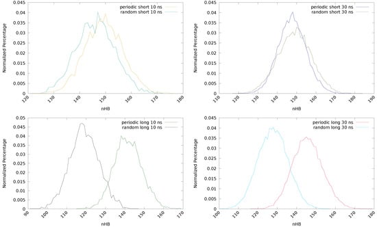 Normalized percentage of hydrogen bonds of the periodic and random conformations with short (top) and long (bottom) chains, obtained after 10 (left) and 30 (right) ns of simulation.