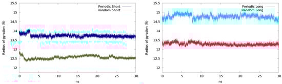 Radius of gyration (Å) of the periodic and random systems with the short (left) and long (right) chains obtained in 30 ns simulations.