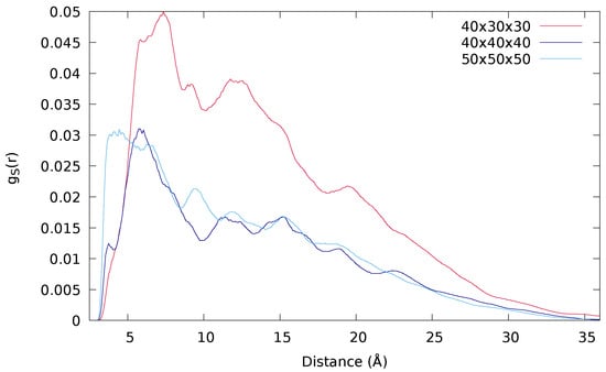 Another important parameter is the size and shape of the simulation box, which determines the density of the system. In the simulations of Ref. [], a square prism of 40 × 30 × 30 nm was used and now it has been compared to a cubic box of two different sizes: 40 × 40 × 40 nm and 50 × 50 × 50 nm. The results are collected in Table 2 and Figure 5, where the radial distribution function of each sulfur with respect to the others is represented, excluding their counterparts in the disulfide S-S bond. Despite the number of hydrogen bonds remains basically unchanged, the shape and the size of the box have a remarkable impact on the radial distribution function and, thus, in . This suggests that there is a frontier effect that may be avoided using larger and regular boxes.
