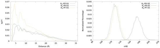 In Figure 6 (left), the radial distribution functions of sulfur for the three derivatives are represented. It can be seen that the PF derivative present higher peaks (larger values of disulfide population) at rather close distances and decay more rapidly than the other two. Taking into account the structure of this derivative (see Figure 1), the absence of the phenyl ring may favour the presence of neighbouring disulfides closer. The steric hindering caused by the phenyls is also clearly seen in the radial distribution functions of the PD and PA, as they show lower values than PF of disulfide population at distances where the phenyl rings are expected to be (<10 Å). Moreover, since in PF and PA the disulfide bond is directly attached to a group that can form hydrogen bonds (the amino group), these interactions may contribute to limiting the mobility of the disulfides and, therefore, hindering their approach. This feature is reflected in the radial distribution functions, where PF and PA show the highest peaks shifted to longer distances compared to that of PD, especially for PA, for which both the reduced mobility due to hydrogen bonding and the steric hindrance of the phenyls contribute to shifting this peak to even longer distances than for PF.