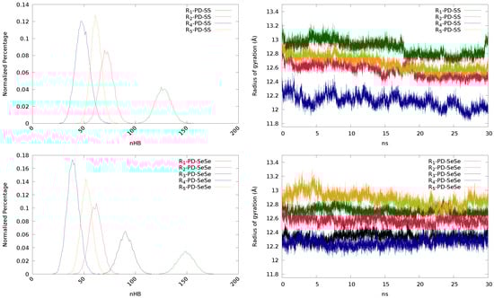 Normalized percentage of hydrogen bonds (left) and radius of gyration (right), in Å, of the disulfide (top) and diselenide (bottom) derivatives.
